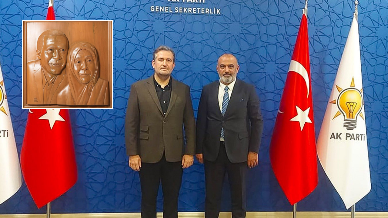 AK Parti’li Bayram Bingöl, Endonezya’da gerçek gül ağacından özel olarak hazırlattığı tabloyu Cumhurbaşkanı Recep Tayyip Erdoğan’a iletilmek üzere AK Parti Genel Sekreter Yardımcısı Kenan Volkan Demirel’e teslim etti.