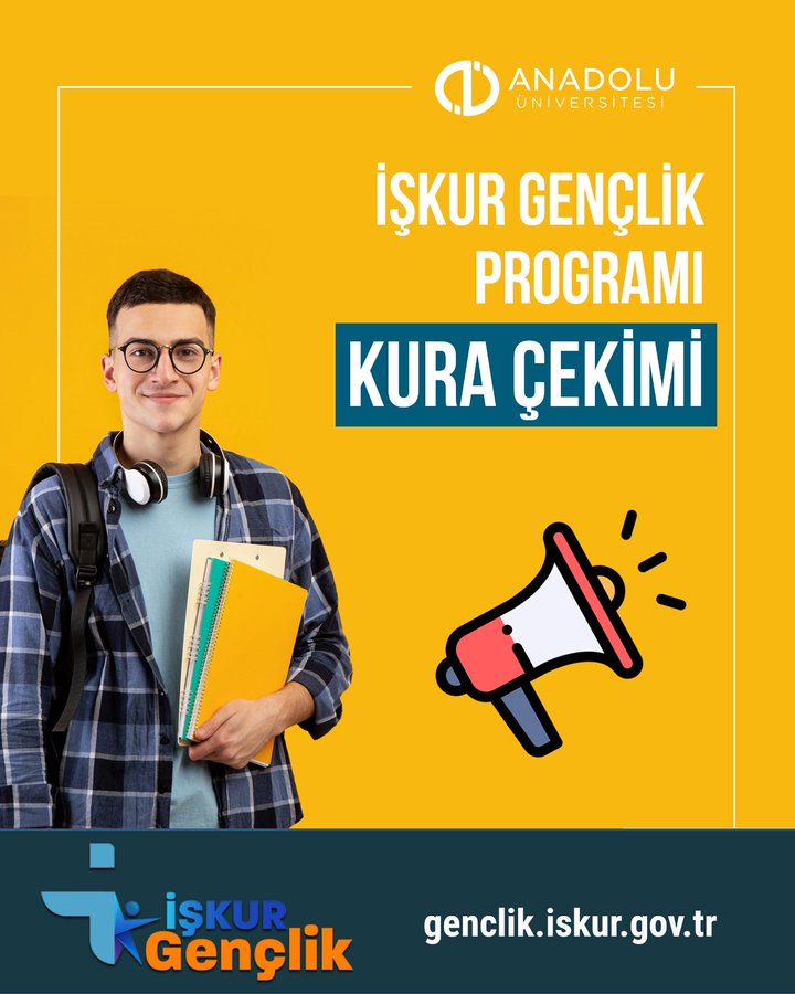 Anadolu Üniversitesi Rektörlüğü ile Eskişehir İŞKUR İl Müdürlüğü iş birliğinde; sürdürülebilir kampüs, kampüs altyapı ve bakım, sosyal ve kültürel faaliyetler, akademik ve idari destek, toplumsal hizmet ve iş birliği, öğrenci gelişim ve uyum, dijital dönüşüm ve inovasyon ile girişimcilik ekosistemi faaliyetlerini desteklemek amacıyla düzenlenen, 1179 kişilik İŞKUR Gençlik Programı'nın noter kura çekimi 14 Ekim 2025 tarihinde saat 14.00'de Koral ÇALGAN salonunda yapılacaktır.
