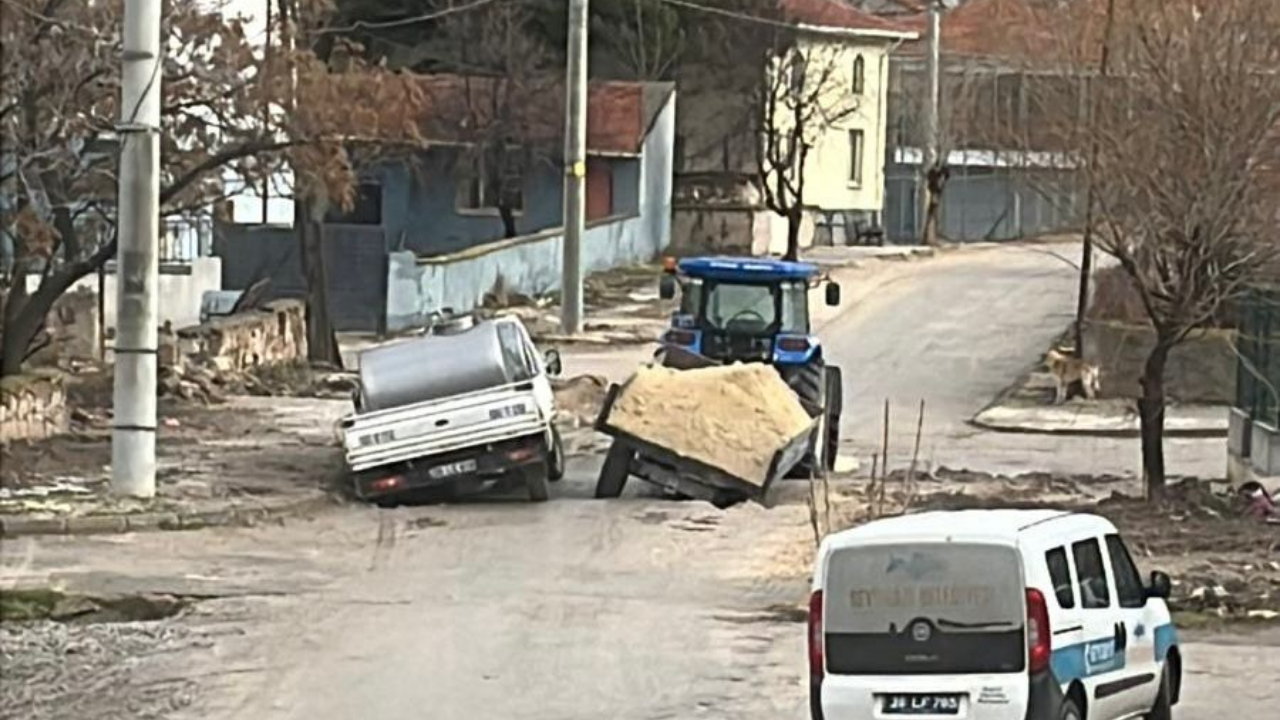 Bir yanda Belediyeye ait traktör, bir yanda özel bir işletmeye ait süt toplama aracı bir yanda da şaşkınlık ve çaresizlikle bu görüntüyü izleyen başka bir Belediye Aracı.