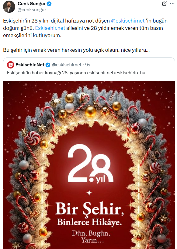 28 yıl önce bugün temellerini atan eskisehir.net'in yıl dönümü kapsamında Eskişehir Odunpazarı Belediye Meclis Üyesi, ESKAFDER Yönetim Kurulu Üyesi, Odunpazarı Kent Konseyi Genel Sekreteri Cenk Sungur, sosyal medya hesabında bir paylaşımda bulundu.