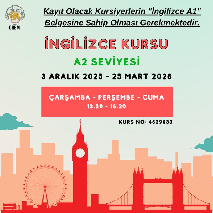 Eskişehir Odunpazarı Halk Eğitim Merkezi, yeni dönem A2 seviye İngilizce kursu için kayıtların başladığını duyurdu. Kursun 3 Aralık 2025 Çarşamba günü başlayacağı ve 25 Mart 2026 tarihine kadar devam edeceği belirtildi.