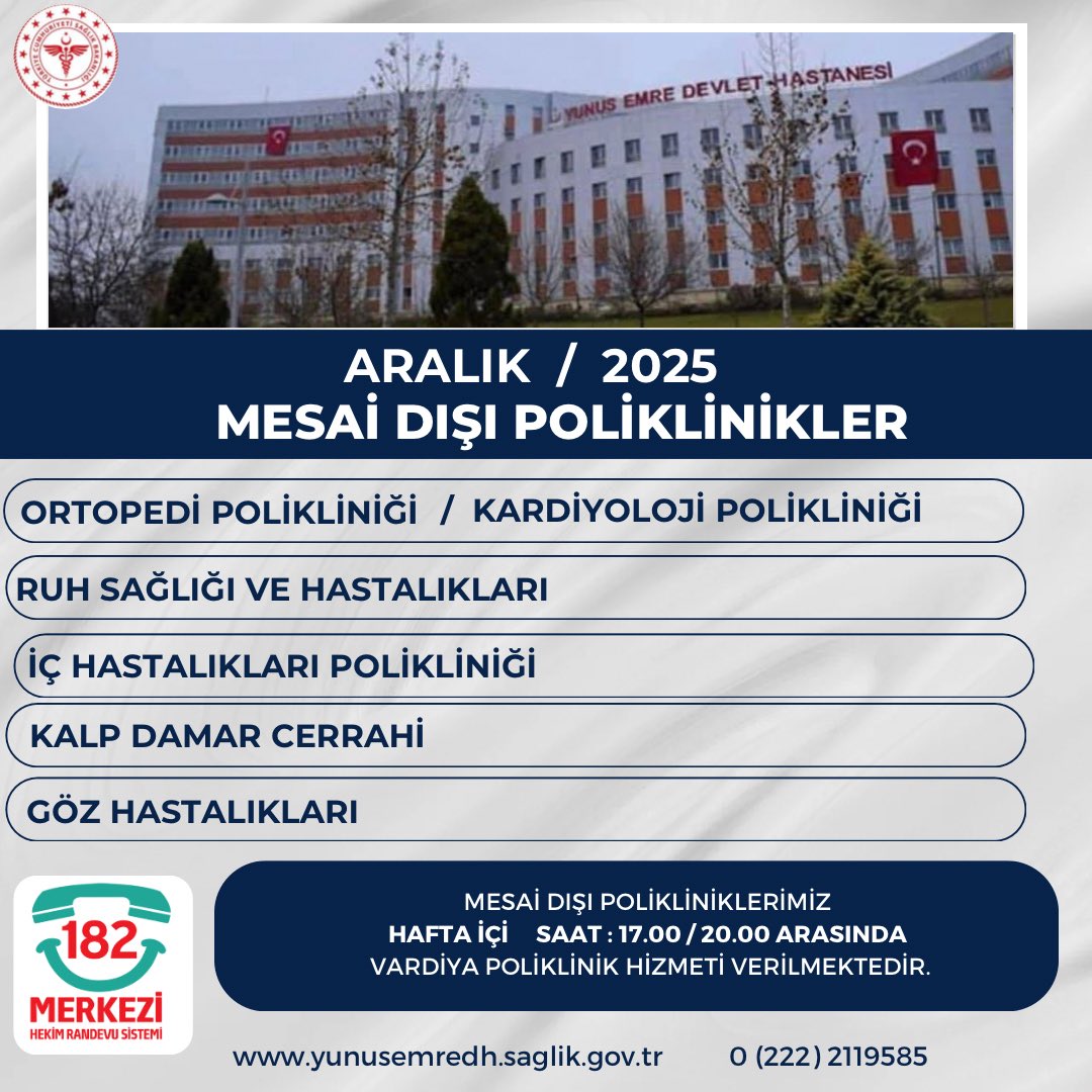 Yunus Emre Devlet Hastanesi, Aralık 2025’te mesai dışı poliklinik hizmeti sunacağını duyurdu.