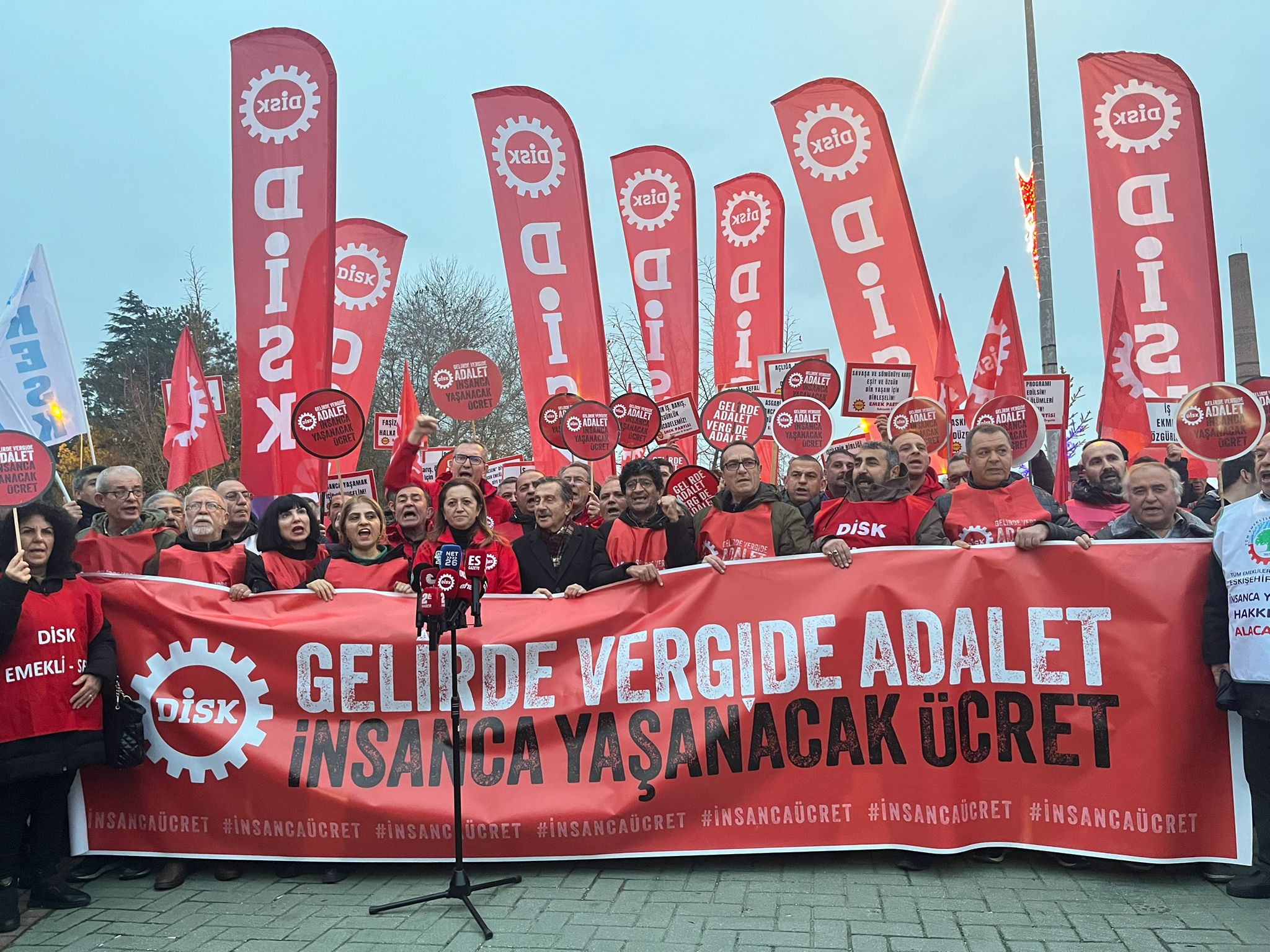 DİSK tarafından İstanbul Kartal Meydanı’ndan başlatılan ve Ankara’ya uzanan yürüyüşün ikinci gününde Eskişehir’de basın açıklaması yapıldı. Genel Başkan Arzu Çerkezoğlu, yürüyüşün Gebze, Kocaeli ve Bursa duraklarının ardından Eskişehir’de sürdüğünü belirterek, “Gelirde adalet, vergide adalet ve ürettiğimiz değerin hakça paylaşımı için yürüyoruz” dedi.