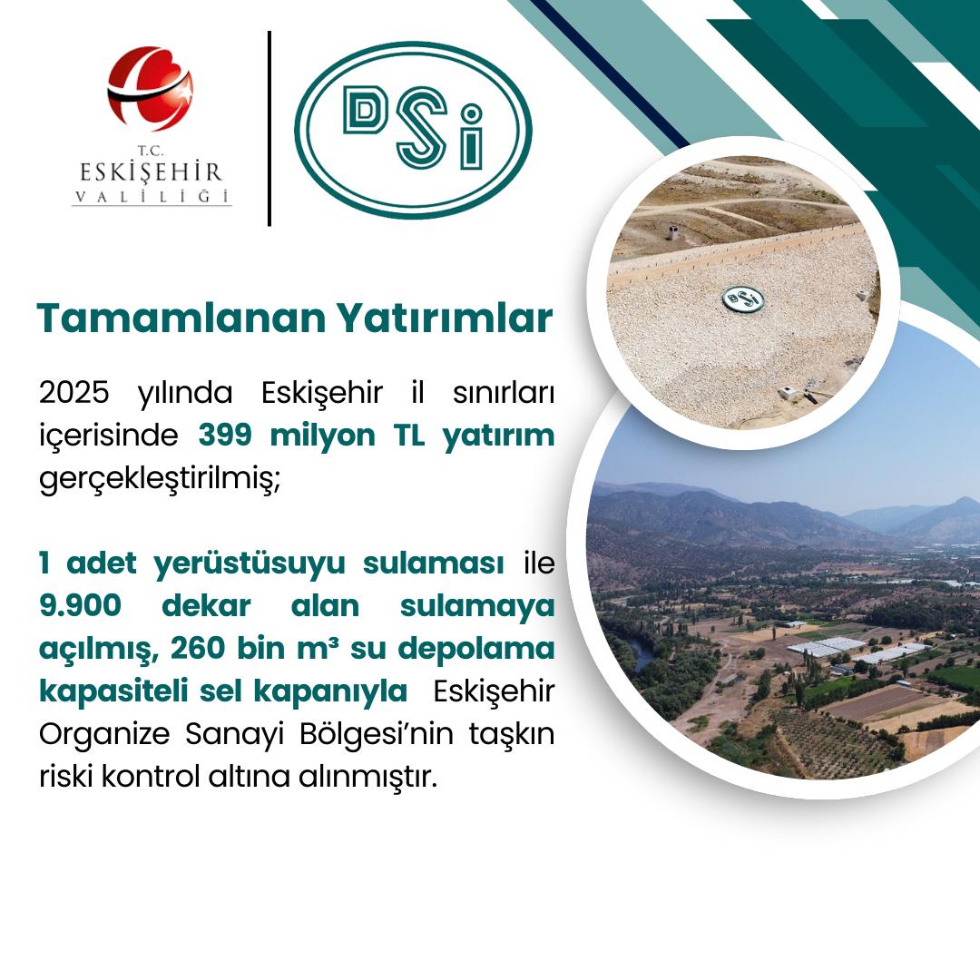 DSİ tarafından 2025 yılı içerisinde Eskişehir il sınırları içinde toplam 399 milyon TL’lik yatırım gerçekleştirildi. Bu kapsamda: 1 adet yerüstü suyu sulama tesisi ile 9 bin 900 dekar tarım arazisi sulamaya açıldı, 260 bin metreküp su depolama kapasiteli sel kapanı inşa edilerek Eskişehir Organize Sanayi Bölgesi’nin taşkın riski kontrol altına alındı.