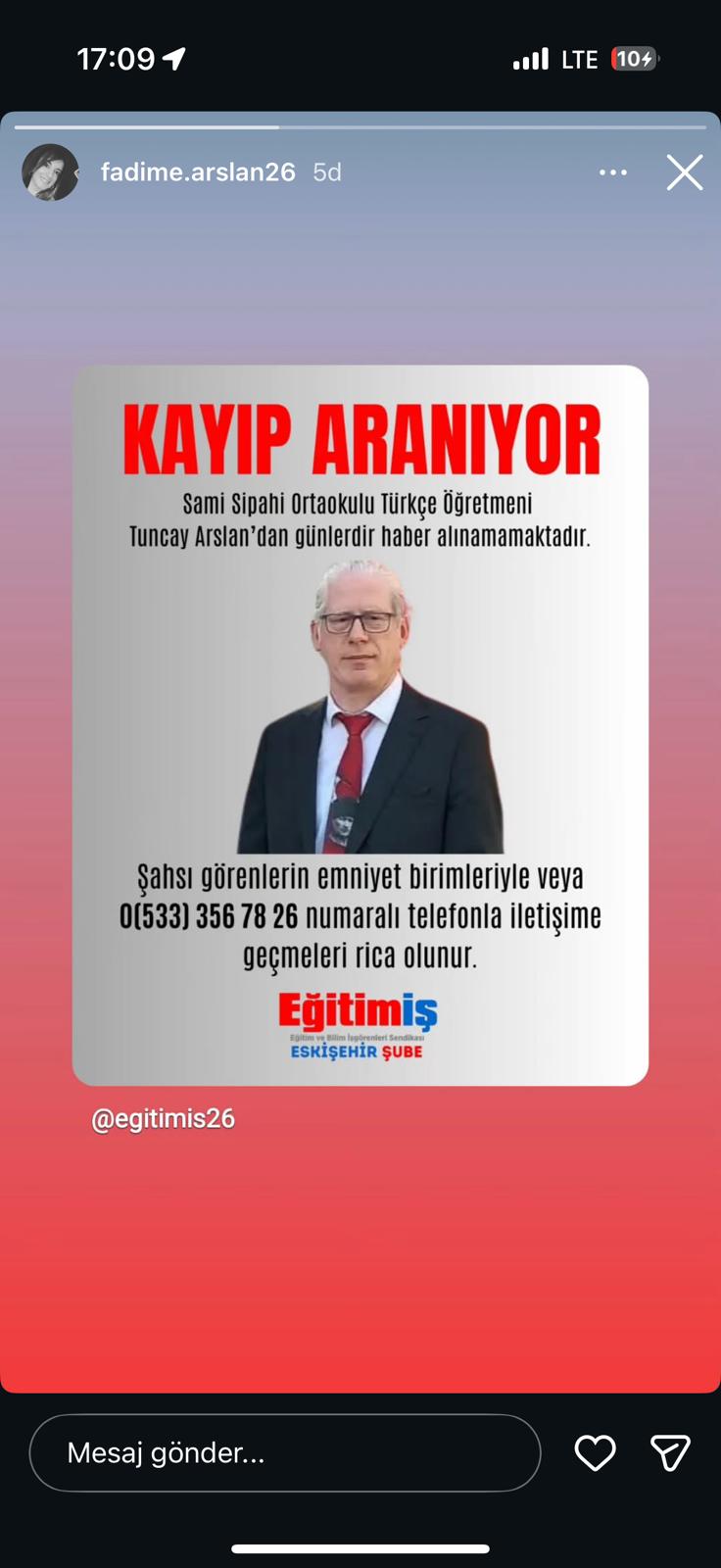 Eğitim-İş Eskişehir Şube Başkanı Fadime Arslan, eşi Tuncay Arslan'a ait olan kayıp ilanını sosyal medya hesaplarından paylaştı.