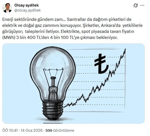 Konuyla ilgili detaylar sektörün nabzını tutan isimlerden geliyor. Gazeteci Olcay Aydilek’in paylaştığı bilgilere göre, enerji sektöründe zam görüşmeleri başladı. Sosyal medya hesabı üzerinden yaptığı açıklamada, sürecin işleyişine dair ipuçları verdi. Aydilek, "Enerji sektöründe gündem zam" diyerek mevcut durumu özetledi. Santrallar da dağıtım şirketleri de elektrik ve doğal gaz zammını konuşuyor. Şirketler, Ankara’da yetkililerle görüşüyor; taleplerini iletiyor. İfadeler, zam sürecinin resmiyet kazanmasa da fiilen başladığını gösteriyor. Elektrikte, spot piyasada tavan fiyatın 3 bin 400 TL'den 4 bin 100 TL'ye çıkması bekleniyor.