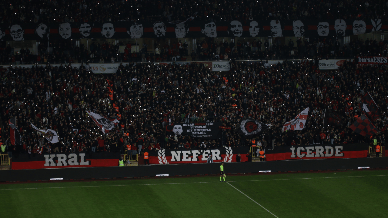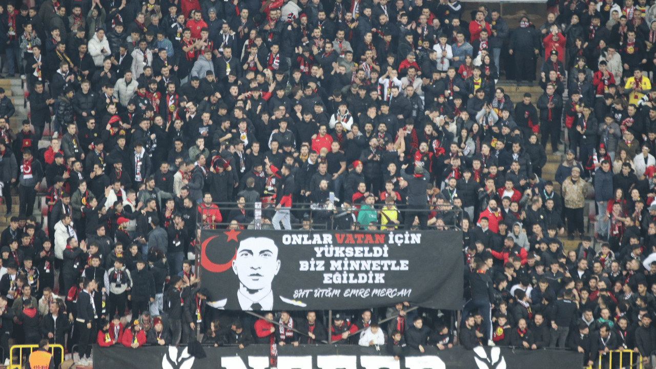 Tribünlerde açılan özel pankartta “Onlar vatan için yükseldi, biz minnetle eğildik” ifadeleri yer alırken, şehit Üsteğmen Mercan’ın fotoğrafı da pankartta paylaşıldı.