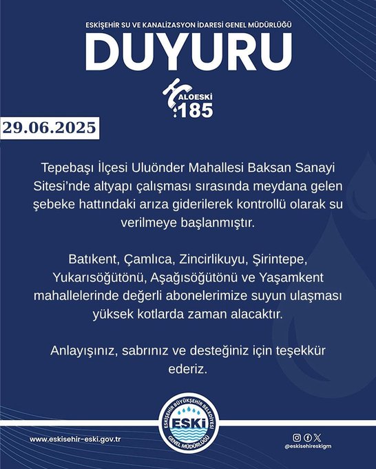 "Tepebaşı İlçesi Uluönder Mahallesi Baksan Sanayi Sitesi'nde altyapı çalışması sırasında meydana gelen şebeke hattındaki arıza giderilerek kontrollü olarak su verilmeye başlanmıştır. Batıkent, Çamlıca, Zincirlikuyu, Şirintepe, Yukarısöğütönü, Aşağısöğütönü ve Yaşamkent mahallelerinde değerli abonelerimize suyun ulaşması yüksek kotlarda zaman alacaktır. Anlayışınız, sabrınız ve desteğiniz için teşekkür ederiz."