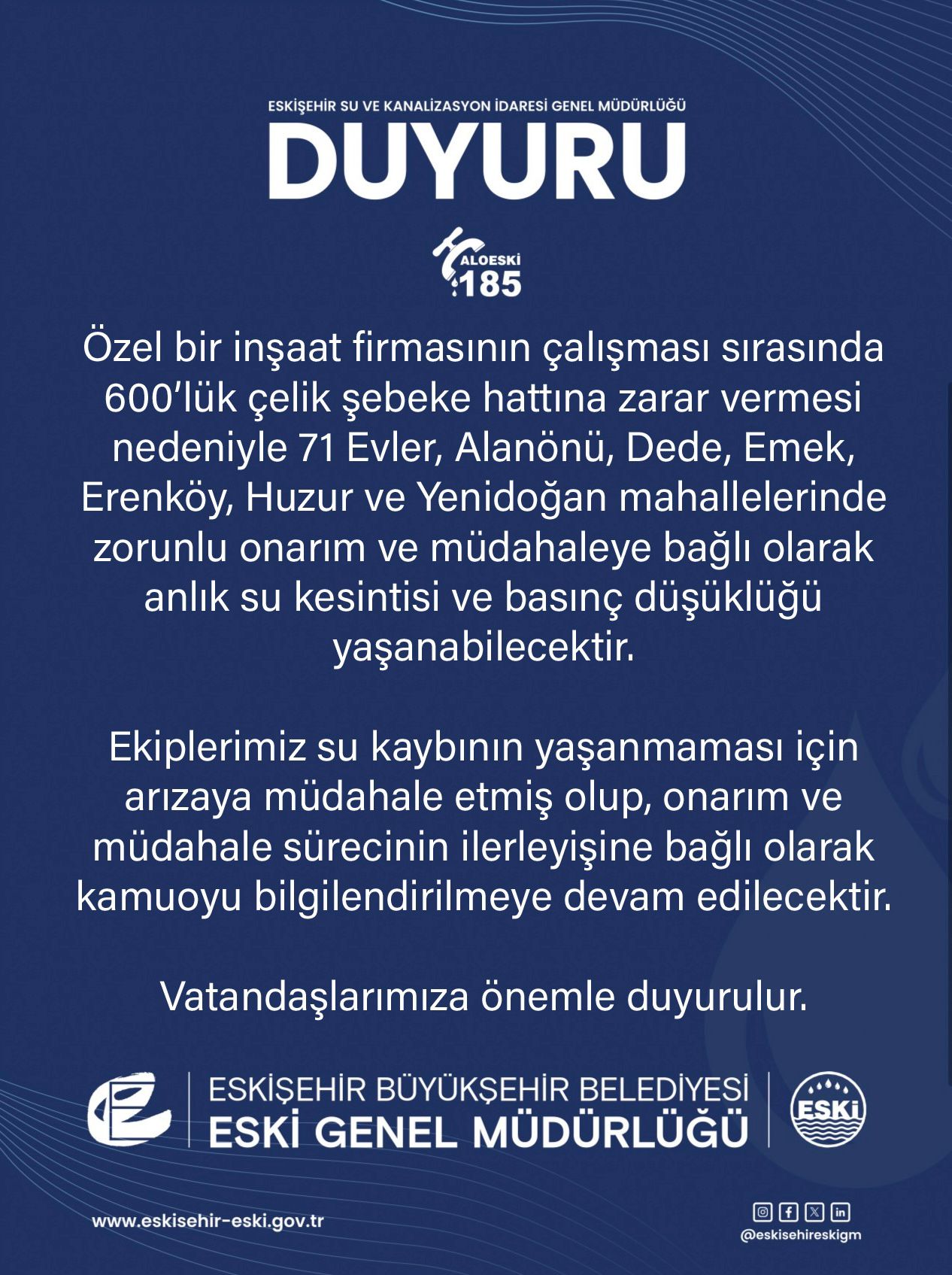 Eskişehir Su ve Kanalizasyon Genel Müdürlüğü (ESKİ), özel bir inşaat çalışması sırasında 600’lük çelik şebeke hattına zarar verilmesi nedeniyle bazı mahallelerde su kesintisi ve basınç düşüklüğü yaşanabileceğini duyurdu.