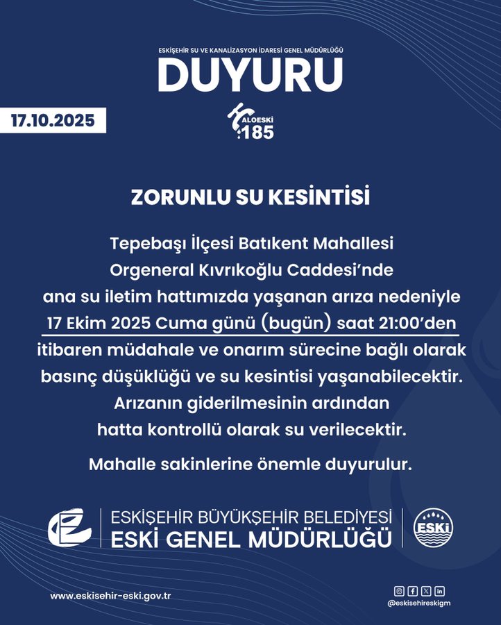 Eskişehir Su ve Kanalizasyon İdaresi Genel Müdürlüğü'nden yapılan açıklama şu şekilde; "Tepebaşı İlçesi Batıkent Mahallesi Orgeneral Kıvrıkoğlu Caddesi’nda ana su iletim hattımızda yaşanan arıza nedeniyle 17 Ekim 2025 Cuma günü (bugün) saat 21:00’den itibaren müdahale ve onarım sürecine bağlı olarak basınç düşüklüğü ve su kesintisi yaşanabilecektir. Arızanın giderilmesinin ardından hatta kontrollü olarak su verilecektir. Mahalle sakinlerine duyurulur"