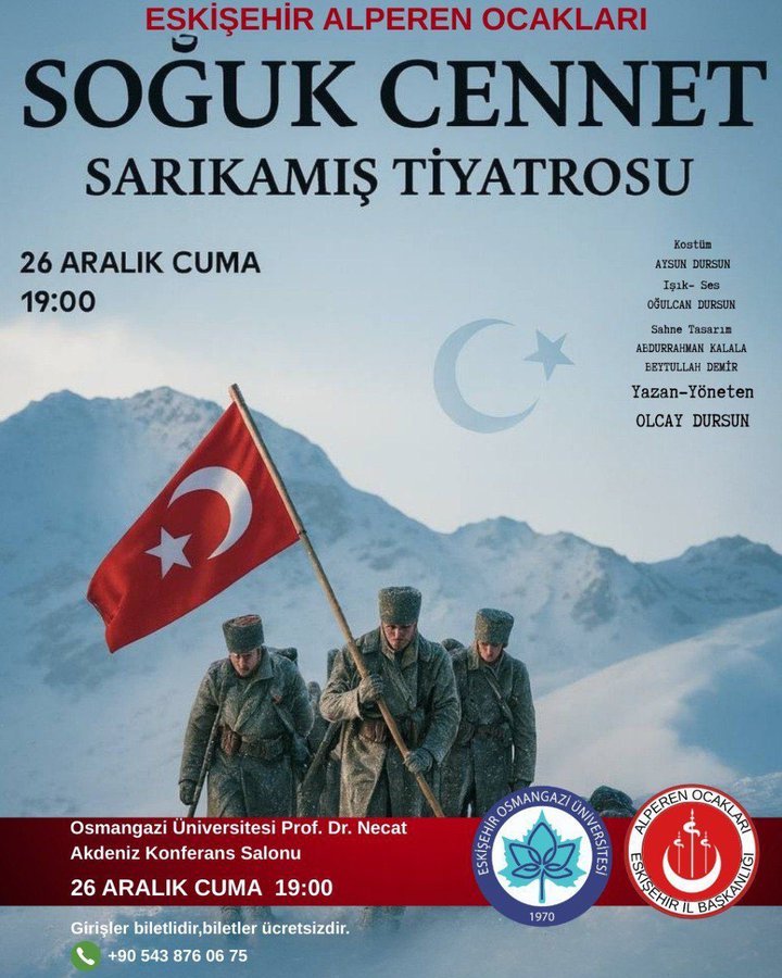 Profesyonel tiyatro ekibi tarafından sahnelenecek olan “Soğuk Cennet Sarıkamış” adlı oyun, 26 Aralık 2025 Cuma günü saat 19.00’da Eskişehir Osmangazi Üniversitesi Prof. Dr. Necat Akdeniz Konferans Salonu’nda izleyiciyle buluşacak. Etkinliğe katılım için bilet zorunluluğu bulunuyor ve biletler ücretsiz olarak temin edilebilecek.