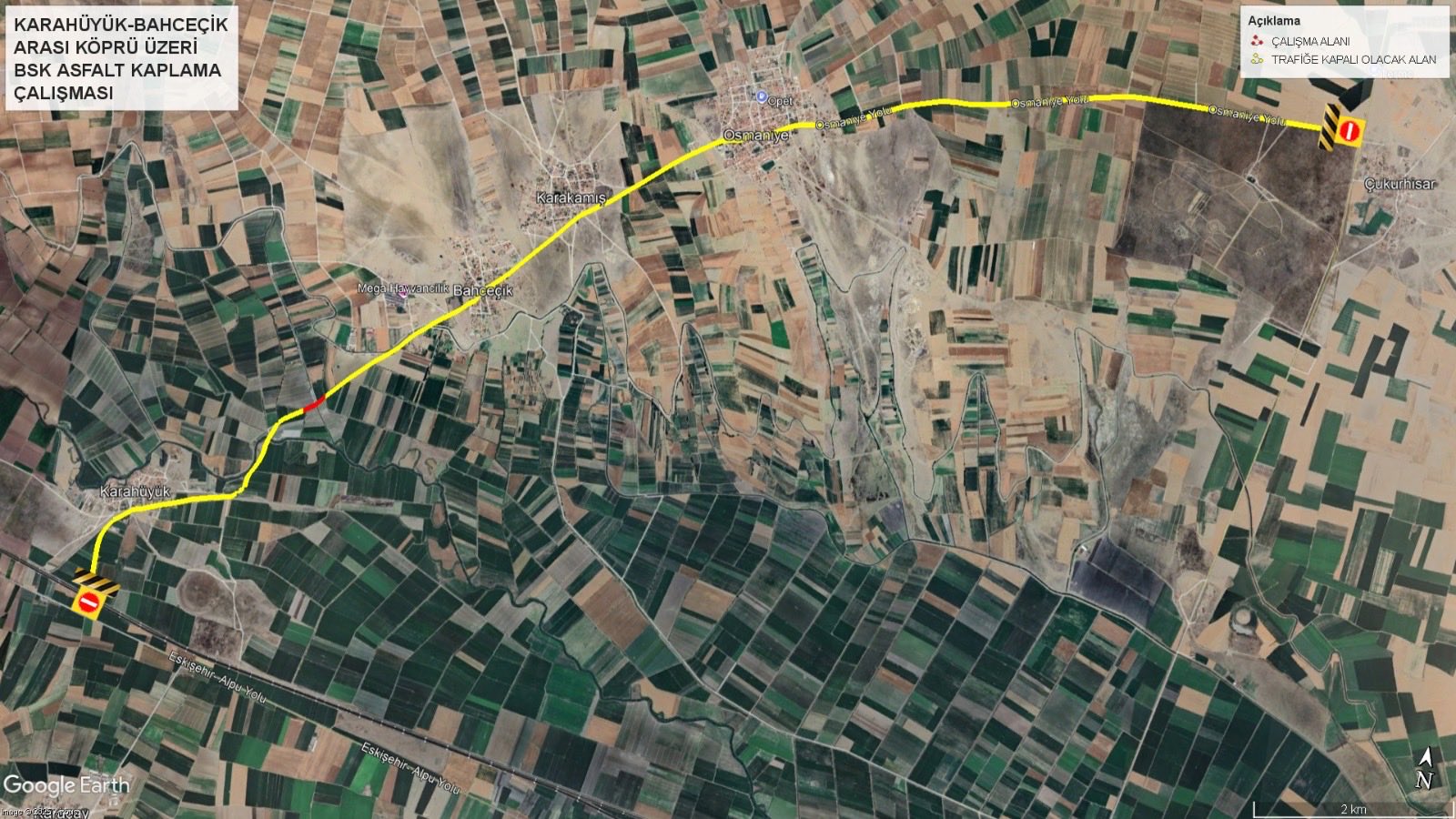 Eskişehir Büyükşehir Belediyesi, Karahüyük ve Bahçeçik mahallelerini birbirine bağlayan köprüde 11 Ekim Cumartesi günü asfalt kaplama çalışması yapacak. 09.00–18.00 saatleri arasında yol trafiğe kapalı olacak. Sürücülere alternatif güzergâhları kullanmaları önerildi.