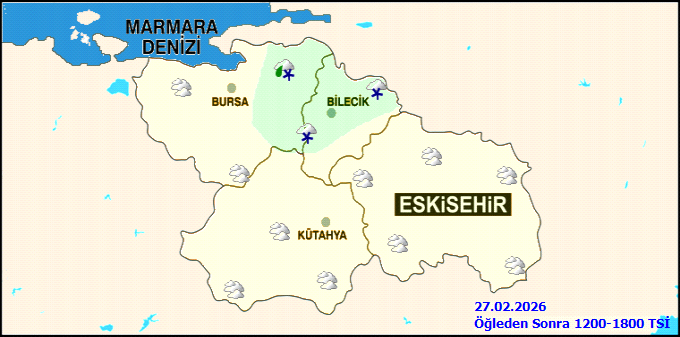 Bölgede havanın parçalı ve çok bulutlu olacağı, yarın sabah saatlerinden itibaren Bilecik il geneli ile Eskişehir ve Bursa'nın kuzey kesimlerinin hafif yağmur, karla karışık yağmur ve kar yağışlı geçeceği tahmin edilmekte.