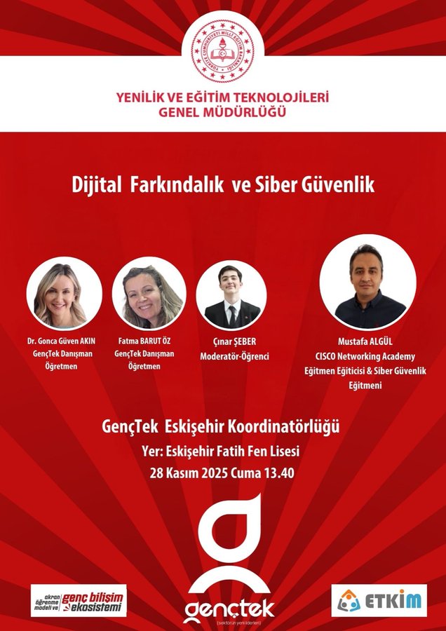 Etkinlikte, Cisco Networking Academy eğitmeni Mustafa Algül öğrencilerle bir araya gelerek, dijital dünyada bilinçli ve güvenli bireyler olmanın yollarını paylaşacak. Program, GençTek Danışman Öğretmenleri Dr. Gonca Güven Akın ve Fatma Barut Öz rehberliğinde gerçekleştirilecek.