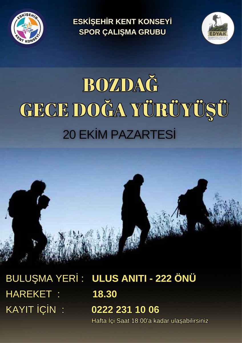Yapılan duyuruda, "Dünyaca ünlü yürüyüş yollarına ev sahipliği yapan güzel şehrimizde; doğayla iç içe, hem ruhunuzu hem bedeninizi dinlendirecek “Bozdağ Gece Doğa Yürüşü” ne katılarak, şehir stresinden uzaklaşıp kendinize bir adım daha yaklaşın... "Spor herkes içindir" ilkesi ile günübirlik yürüyüşler, trekking, kaya tırmanışı ve ekspedisyonlarının yanısıra ilkyardım, dağcılık ekipmanları ve kaya tırmanışı üzerine eğitim çalışmalarını sürdüren Spor Çalışma Grubumuz ve EDYAK Spor Kulübü paydaşlığında düzenleyeceğimiz etkinliğimize tüm doğaseverleri bekliyoruz. Ücretsiz kayıt olmak ve bilgi almak için 231 10 06 numaralı telefondan bizlere ulaşabilir veya Kent Konseyimizi ziyaret edebilirsiniz." denildi.