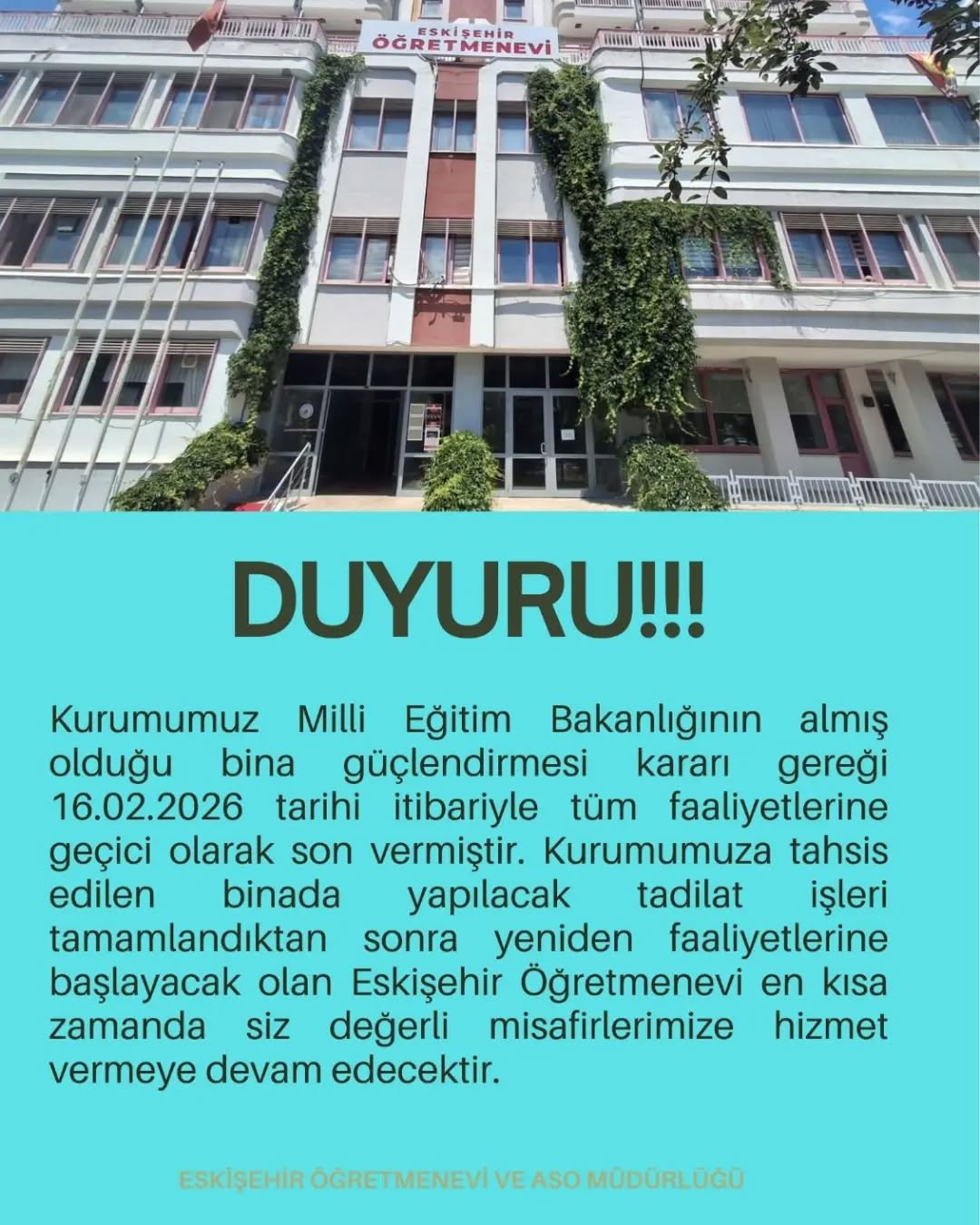 "Kurumumuz Milli Eğitim Bakanlığı’nın almış olduğu bina güçlendirme kararı gereği 16 Şubat 2026 tarihi itibariyle tüm faaliyetlerine geçici olarak vermiştir. Kurumumuza tahsis edilen binada yapılacak tadilat işleri tamamlandıktan sonra yeniden faaliyetlerine başlayacak olan Eskişehir Öğretmenevi en kısa zamanda siz değerli misafirlerimize hizmet vermeye devam edecektir” ifadelerine yer verildi.