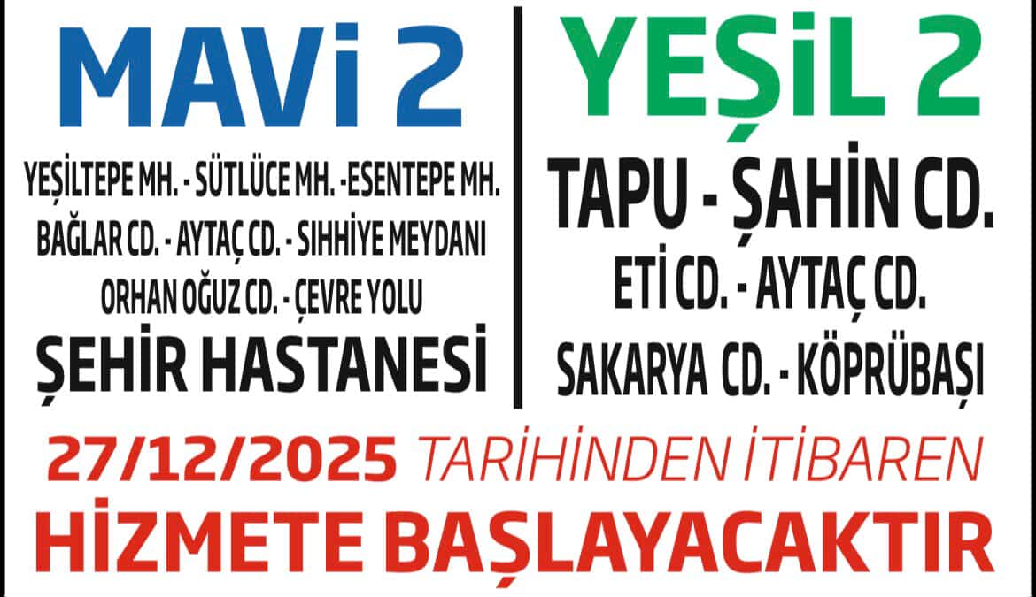 Yapılan düzenleme ile birlikte Sakarya Dolmuş Durağı’nda oluşturulan Mavi 2 ve Yeşil 2 yeni dolmuş hatları, 27 Aralık 2025 tarihinden itibaren hizmet vermeye başlayacak. Özellikle şehir hastanesine ve merkezi noktalara ulaşımda alternatif güzergahlar oluşturulması hedeflendi.