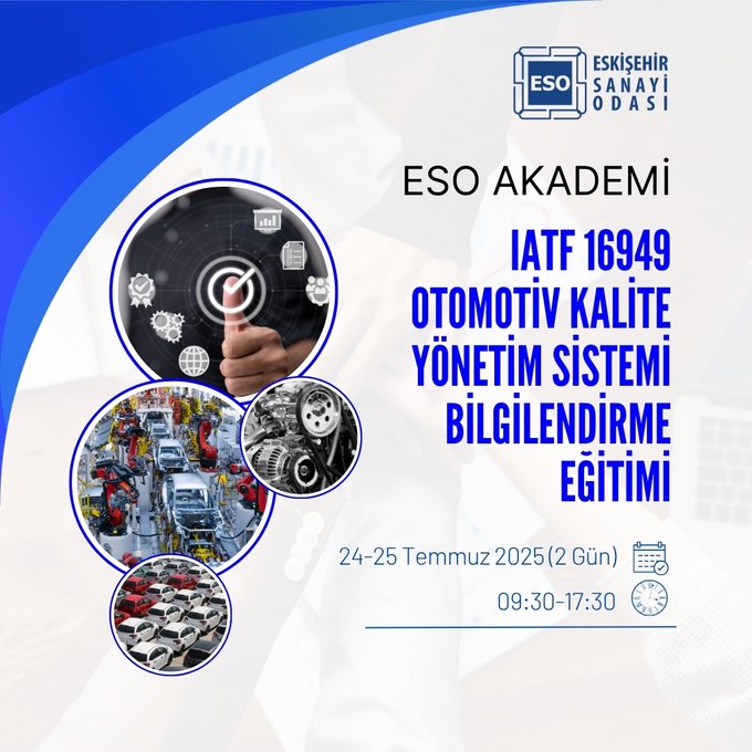 Eskişehir Sanayi Odası (ESO) Akademi tarafından düzenlenecek olan “IATF 16949 Otomotiv Kalite Yönetim Sistemi Bilgilendirme Eğitimi”, 24-25 Temmuz 2025 tarihlerinde gerçekleştirilecek. Otomotiv sektöründe faaliyet gösteren firmaların kalite yönetim süreçlerini geliştirmeyi hedefleyen eğitim, iki gün boyunca 09.30 - 17.30 saatleri arasında katılımcılara yönelik verilecek.