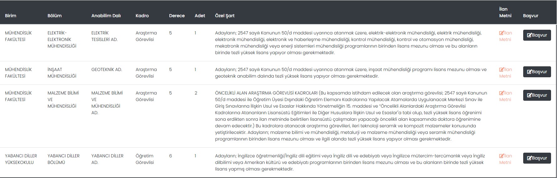 İlan kapsamında Mühendislik Fakültesi ile Yabancı Diller Yüksekokulu bünyesinde Araştırma Görevlisi ve Öğretim Görevlisi kadroları için alım yapılacak.