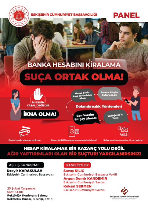 Eskişehir Teknik Üniversitesi'nin sosyal medya hesabından yapılan duyuruya göre, “Banka Hesabını Kiralama, Suça Ortak Olma!” başlıklı panel, Eskişehir Cumhuriyet Başsavcılığı iş birliğiyle düzenlenecek.