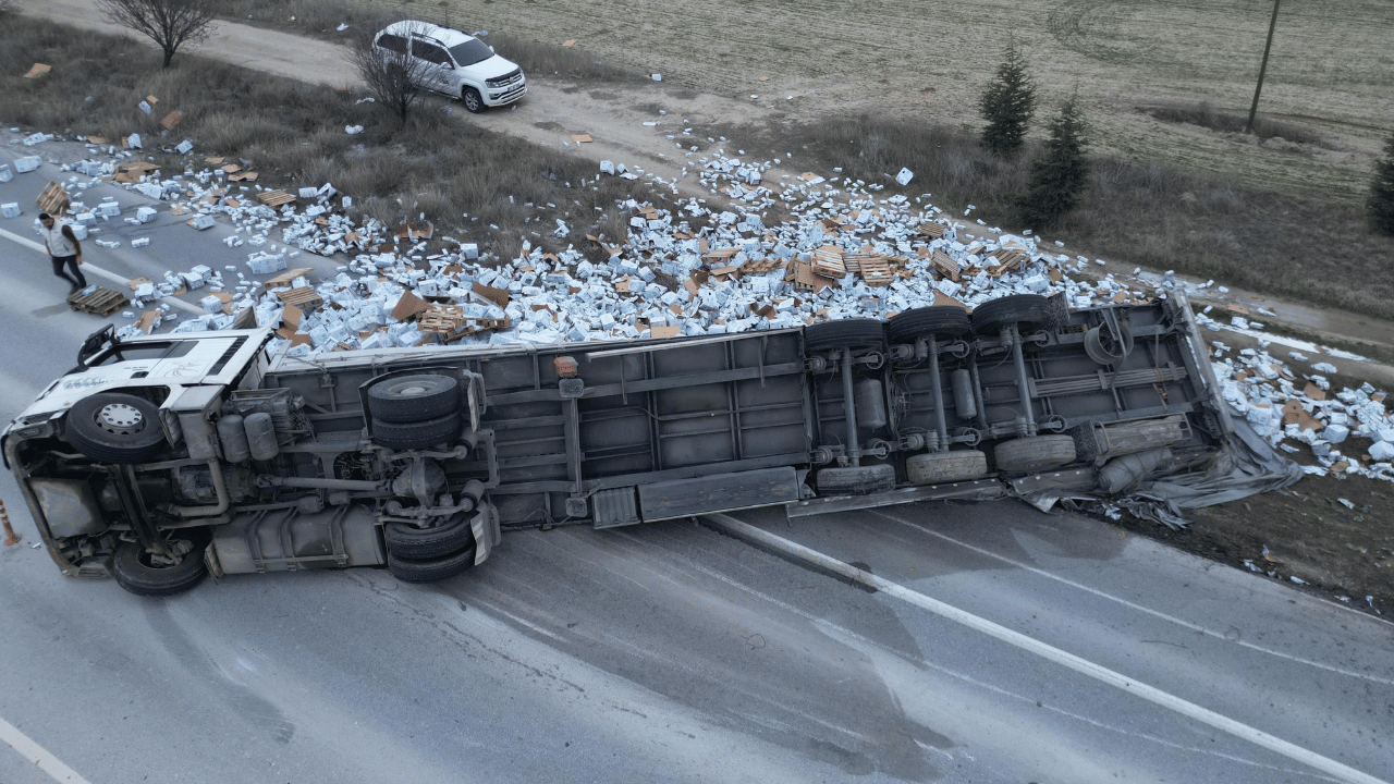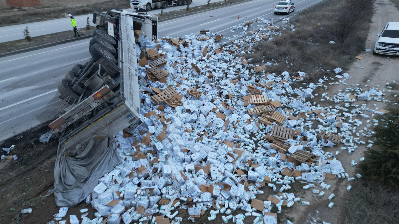Kontrolden çıkan tır karayolunun ortasına devrildi. Aktarılan bilgilere göre, tırın yaklaşık 25 ton pastörize süt taşıdığı belirtildi.