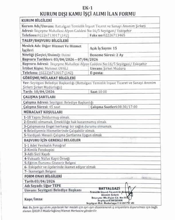 Eskişehir’in Seyitgazi ilçesinde faaliyet gösteren, Seyitgazi Belediye Başkanlığına bağlı olan Battalgazi Temizlik İnşaat Ticaret ve Sanayi Anonim Şirketi, bünyesinde çalıştırılmak üzere 15 daimi işçi alımı yapacağını duyurdu.