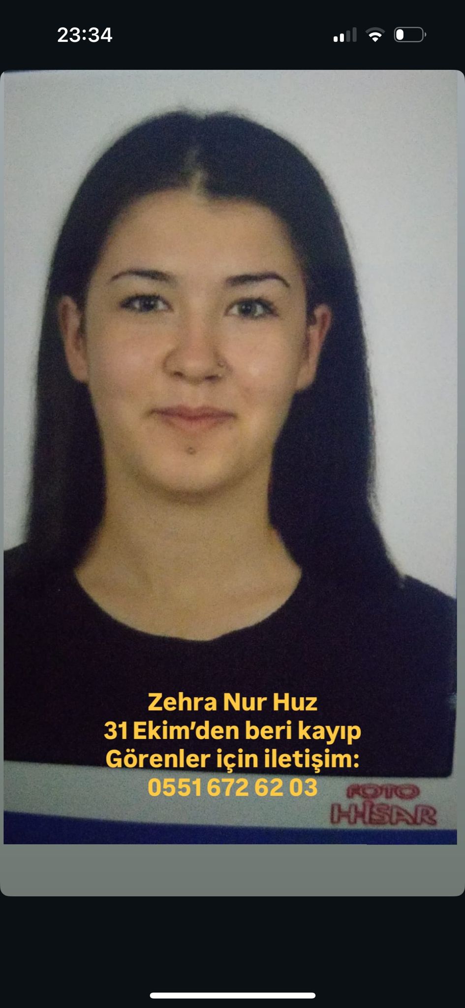 “Emek Mahallesi’nde akrabasının yanında kalan Zehra Nur Huz (17), 31 Ekim Cuma günü saat 10.00’da evden ayrılmış ve geri dönmemiştir. Babası durumu polis ekiplerine bildirmiştir ancak genç kızdan hâlâ haber alınamamaktadır. Aile, kızlarının sağlık durumundan endişe duymaktadır. Eğer Zehra Nur’u gören ya da tanıyan komşularımız, arkadaşlarımız varsa lütfen 112 Polis İhbar Hattı’nı arayarak bilgi versinler. İnşallah en kısa sürede sağ salim bulunur.”