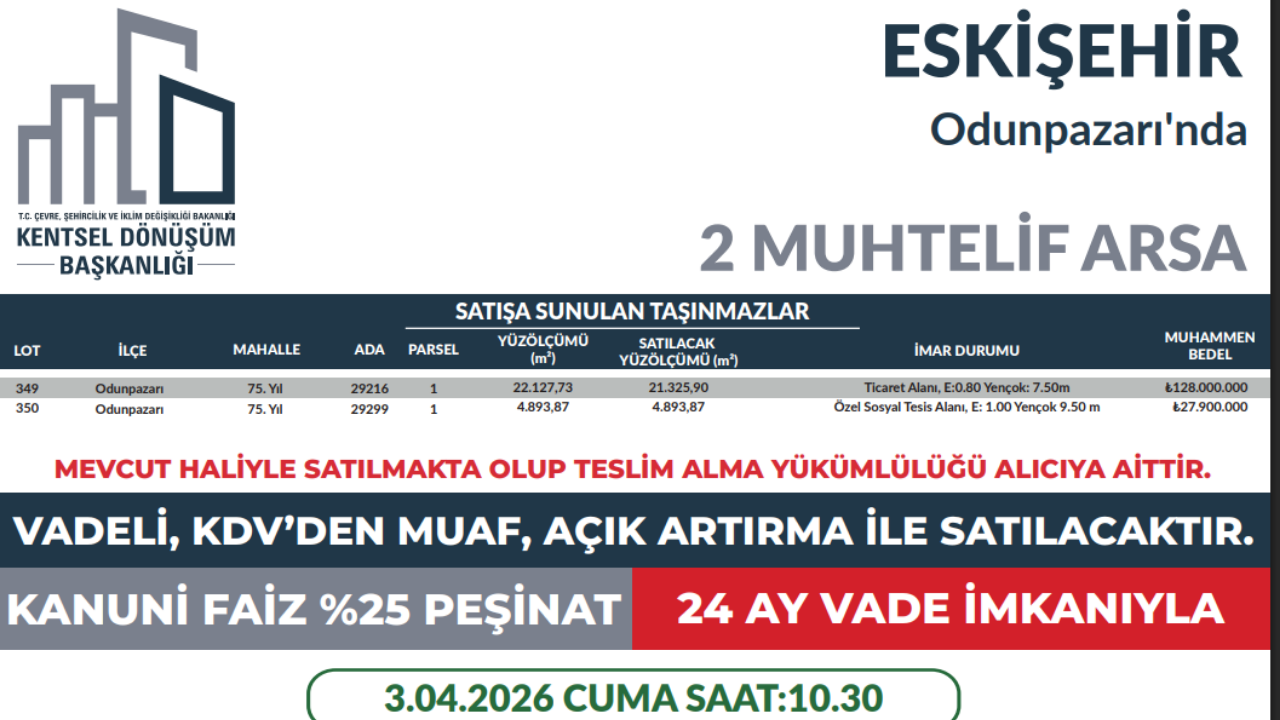 Eskişehir’in Odunpazarı ilçesinde bulunan iki arsayı açık artırma yöntemiyle satışa sunacağı duyuruldu. Satışlar, 3 Nisan 2026 Cuma günü saat 10.30’da gerçekleştirilecek.
