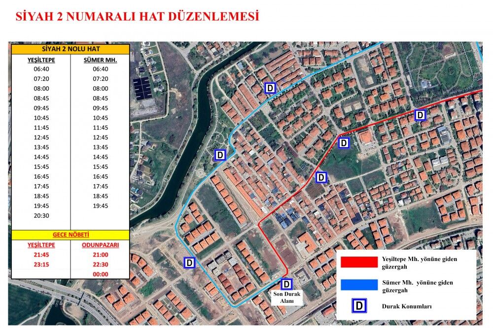 "Toplu taşımada erişilebilirliği artırmak amacıyla Siyah 2, Siyah 9 ve Siyah 70 numaralı otobüs hatlarında güzergâh düzenlemesi yapıldı. Yapılan düzenleme ile hatların güzergâhı Sümer Mahallesi Kızılyer mevkiine kadar uzatıldı. Siyah 2 Yeşiltepe Mahallesi’ne, Siyah 9 Otogar bölgesine, Siyah 70 ise Danişment Mahallesi’ne ulaşım sağlamaya devam ediyor. Güncel sefer saatlerine ESTRAM Mobil uygulaması ve internet sitemizdeki Otobüs Saatleri sekmesinden ulaşabilirsiniz."