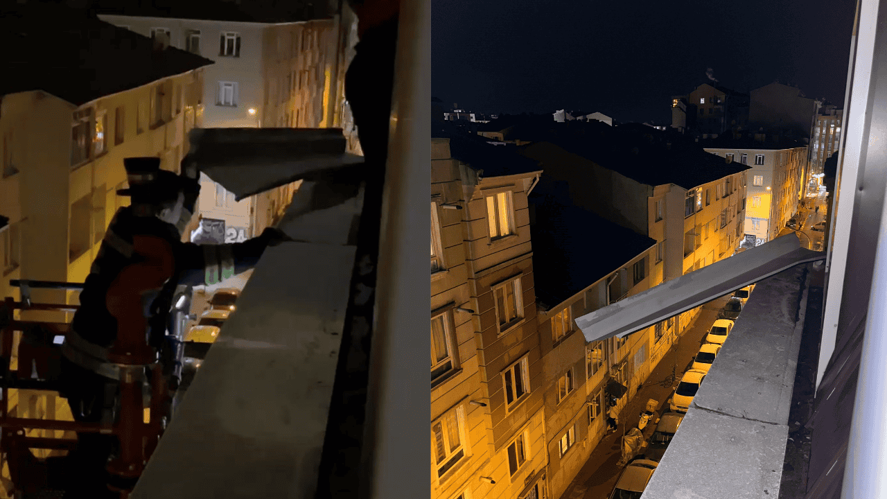 Dün kent genelinde hayatı olumsuz etkileyen şiddetli rüzgar ve fırtına, gece saatlerinde korku dolu anlar yaşanmasına sebep oldu. Binanın üst katlarından rüzgarın etkisiyle aşağı sarkan uzun metal parça, yaya güvenliği açısından büyük risk oluşturdu. Cadde üzerinden geçen vatandaşların güvenliği için durumu fark eden binada yaşayanlar, hemen itfaiye ekiplerini bilgilendirdi.