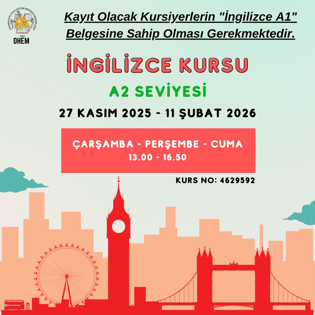 Kurum bünyesinde düzenlenen A1 seviye İngilizce kursu, 27 Kasım Perşembe günü başlıyor. Katılımcıların temel seviyede İngilizce yeterlilik kazanmasını hedefleyen eğitim programı, üç ay boyunca devam edecek.