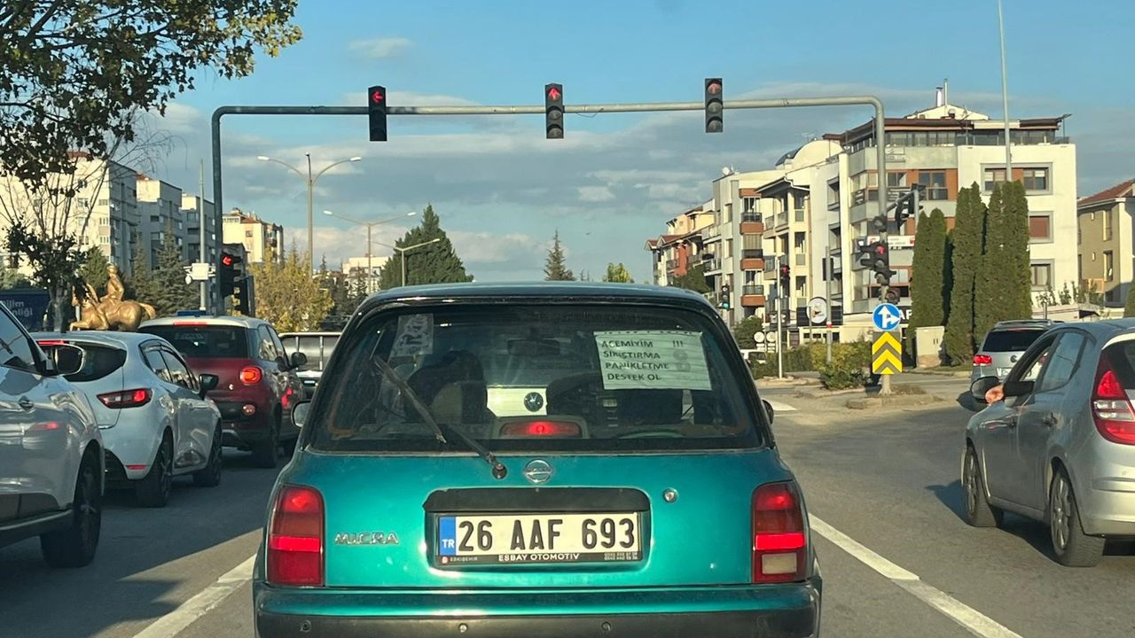 Direksiyon başında olan kadın bir sürücünün otomobilinin arka camına astığı el yazısı not, yoldaki diğer sürücülerin dikkatini çekti. Notta, “Acemiyim, sıkıştırma, panikletme, destek ol” ifadeleri yer aldı.
