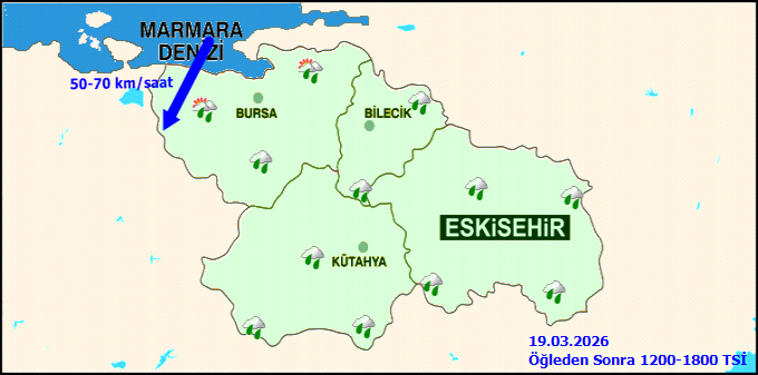 Eskişehir'de sabah 09.00’dan itibaren şehir genelinde sağanak yağışlar bekleniyor, sıcaklıklar 6 derece civarında seyredecek. Öğle saatlerinde (12.00 - 15.00) yağışlar devam edecek ve sıcaklık 7 dereceye çıkacak. Öğleden sonra ise (15.00 - 18.00) sağanak yağışlar etkisini sürdürecek, sıcaklık 5 dereceye düşecek.