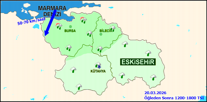 RÜZGAR: Eskişehir ve Bilecik çevrelerinde kuzey ve kuzeybatı yönlerden, Bursa ve Kütahya çevrelerinde ise kuzey ve kuzeydoğu yönlerden genellikle orta kuvvette; Bursa’nın kuzey ve kıyı kesimleri ile Marmara Denizinde kuzeydoğu (Poyraz) yönünden kuvvetli ve kısa süreli fırtına şeklinde eseceği tahmin edilmektedir.