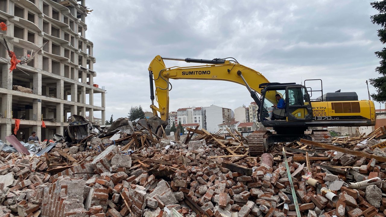 Yıkımın ardından enkaza dönen binada ekiplerin kepçelerle çalışmalarını sürdürdüğü, çevrede ise yoğun toz oluştuğu görüldü.