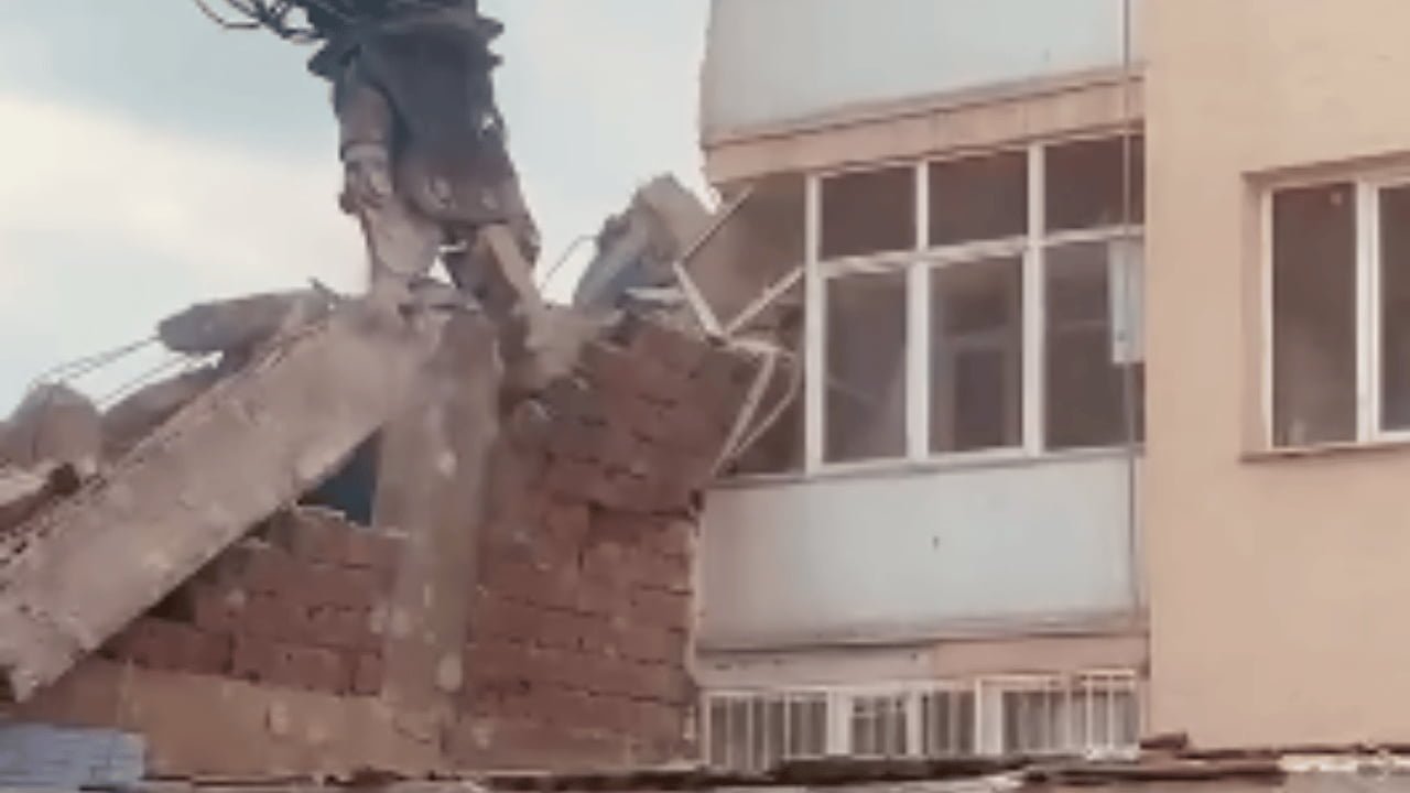 Bugün ise yıkım çalışmaları esnasında binadan kopan moloz parçaları başka bir binanın balkonunu yıktı.