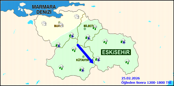 Bölgede havanın çok bulutlu, Bursa ve Bilecik illerinin kuzey kesimlerinden başlamak üzere aralıklı yağmurlu, gece saatleri ile yarın (Çarşamba) sabah saatlerinde Kütahya çevreleri ile Bursa ve Bilecik'in güney kesimlerinin karla karışık yağmur ve kar yağışlı; Eskişehir çevrelerinin yağmur ve karla karışık yağmurlu olarak geçeceği tahmin edilmekte.