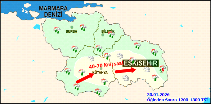 KUVVETLİ RÜZGAR UYARISI: Rüzgarın Eskişehir ve Kütahya il geneli ile Bursa'nın güney ve doğu ilçeleri (Osmangazi, Yıldırım, Kestel, İnegöl, Keles, Orhaneli, Büyükorhan ve Harmancık) , Bilecik'in ise güney ilçelerinde (Pazaryeri ve Bozüyük) güney yönlerden kuvvetli rüzgar ve yer yer fırtına (40-60 km/saat, yükseklerde 60-80 km/saat) şeklinde esmesi bekleniyor. Kuvvetli rüzgarla birlikte; ulaşımda aksamalar, çatı uçması, ağaç devrilmesi, soba ve doğalgaz kaynaklı baca gazı zehirlenmesi gibi olumsuzluklara karşı dikkatli ve tedbirli olunması gerekmektedir.