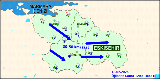 Bölge genelinde havanın çok bulutlu, aralıklı yağmur ve sağanak yağışlı geçeceği; yarın (Çarşamba) öğle saatlerinden sonra üst seviyelerdeki soğuk ve yağışlı hava etkisiyle, hava sıcaklıklarının azalarak, Kütahya ve Bilecik çevreleri ile Bursa'nın güney kesimlerinde yağışların karla karışık yağmur ve kar şekline döneceği tahmin edilmekte. Bu akşam saatlerinde Kütahya'nın güneybatı kesimlerinde yağışların yerel olarak kuvvetli olması beklenmekte.