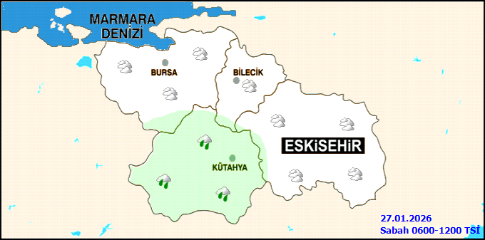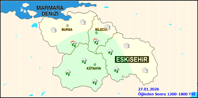 Bölgede havanın çok bulutlu olacağı, bu akşam saatlerinden itibaren Bursa ve Kütahya çevrelerinden başlamak üzere aralıklı yağmur ve sağanak yağışlı geçeceği, ayrıca gece saatlerinde iç kesimlerde yer yer pus hadisesinin görüleceği tahmin edilmektedir.