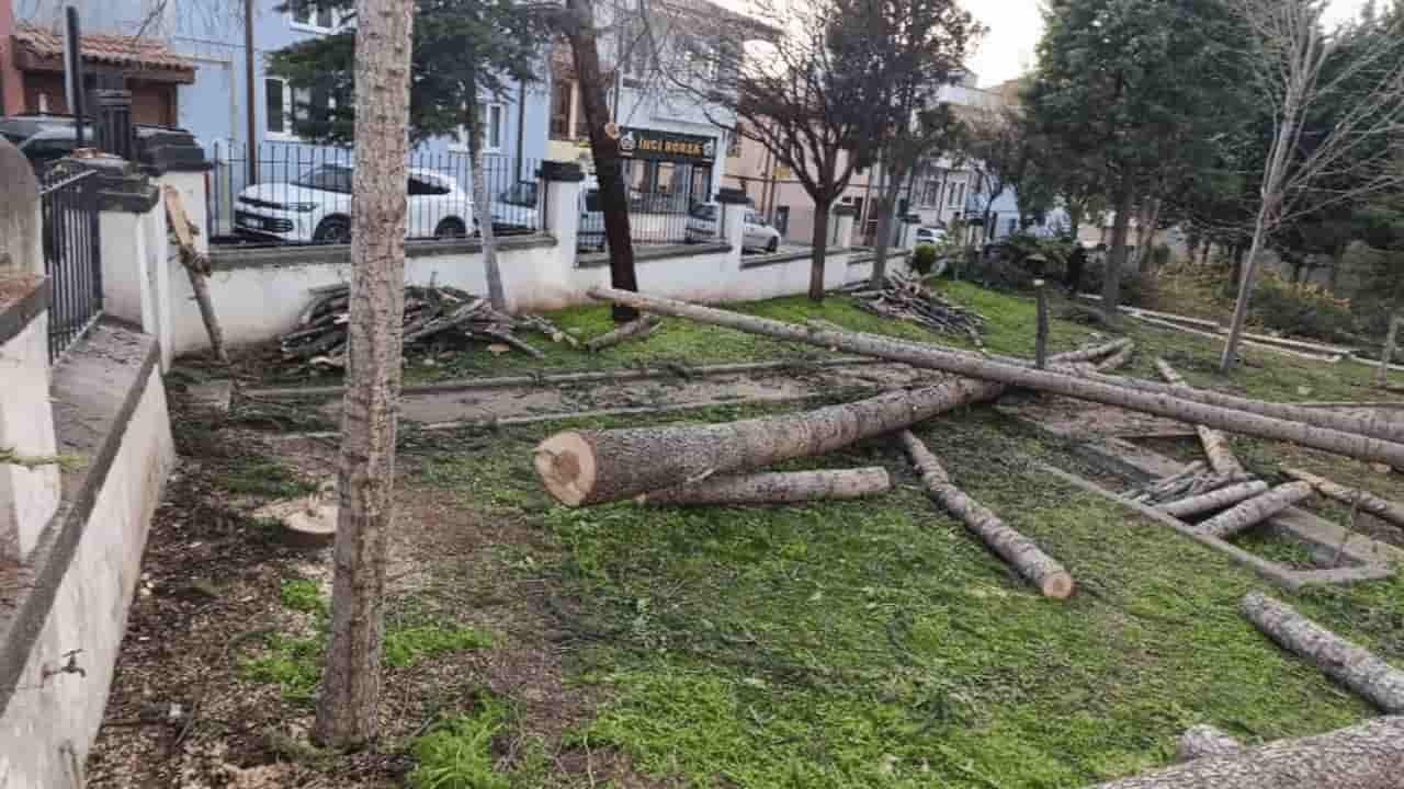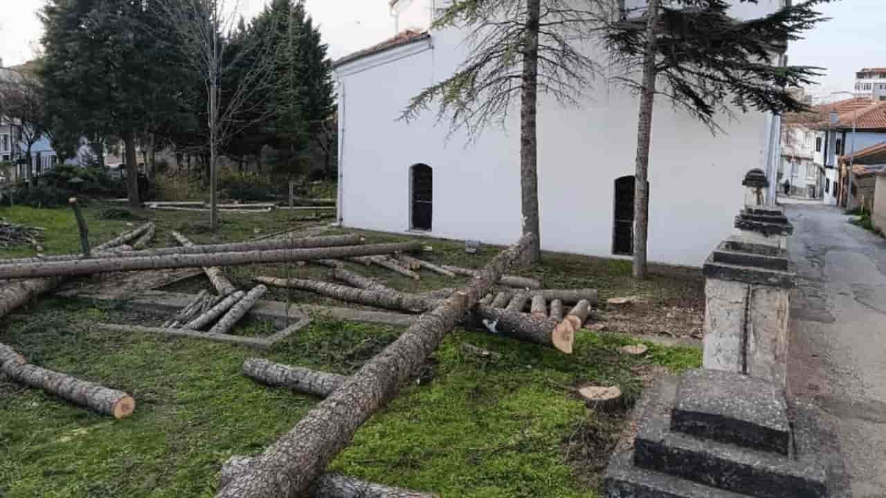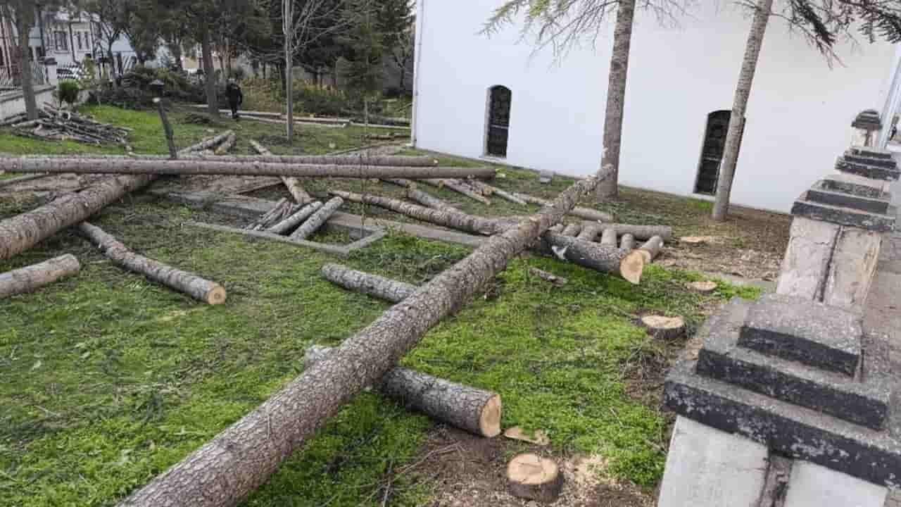 Ağaçların kesilmesine tepki gösteren bir vatandaş, "Caminin bahçesindeki sapa sağlam ağaçlar kesildi" dedi.