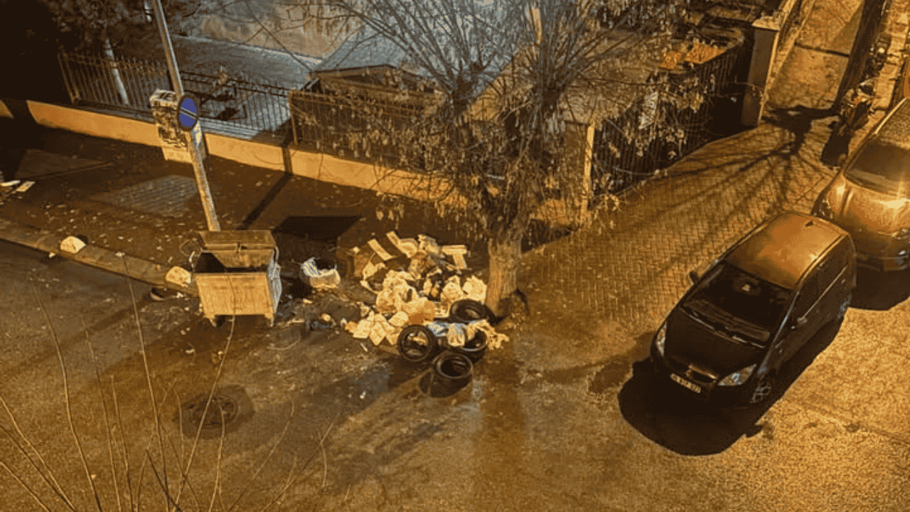Mahalleye giren bir grup şahıs çöp konteynerini olduğu gibi dışarı çıkardı.