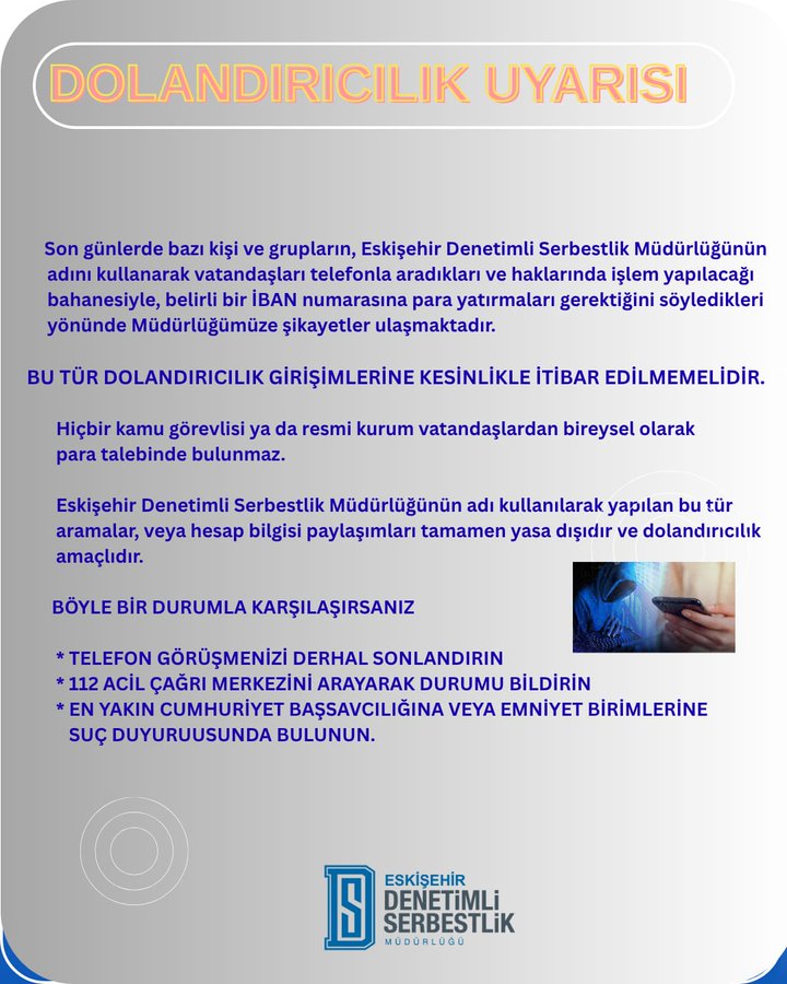 Son günlerde bazı kişi ve grupların, Eskişehir Denetimli Serbestlik Müdürlüğünün adını kullanarak vatandaşları telefonla aradıkları ve haklarında işlem yapılacağı bahanesiyle, belirli bir İBAN numarasına para yatırmaları gerektiğini söyledikleri yönünde Müdürlüğümüze şikayetler ulaşmaktadır.