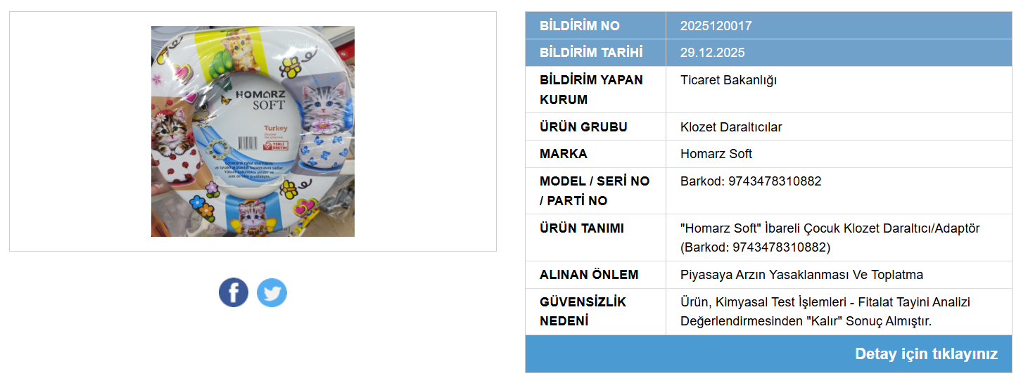 Açıklanan listede, Homarz Soft markasına ait bir klozet daraltıcı ürünün güvenli olmadığı tespit edildi.