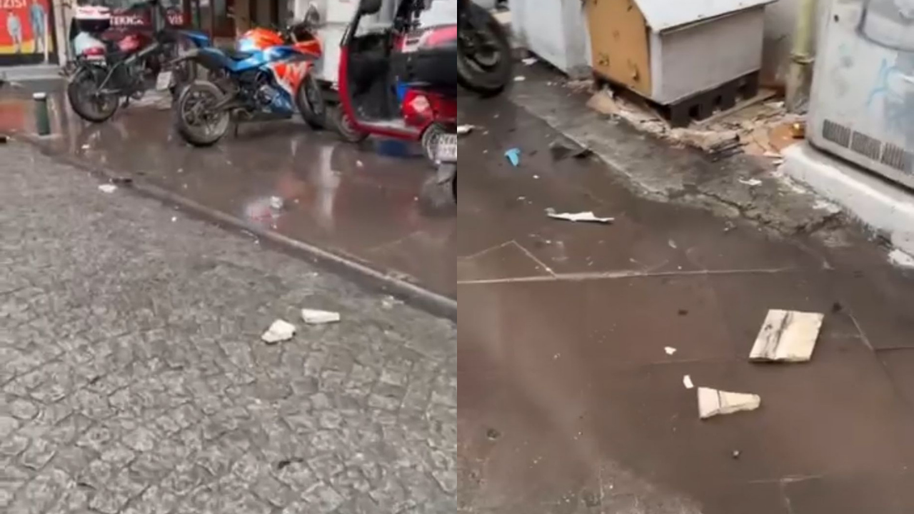 Düşen mermer parçaları, binanın arka kısmında park halinde bulunan motosikletlere isabet etti. O sırada bölgede kimsenin bulunmaması olası bir facianın önüne geçti.