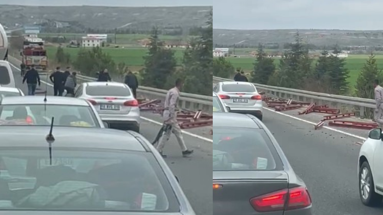 İpleri kopan demir profiller yola savruldu. Profil demirler arkada seyir halinde olan başka bir TIR'a denk geldi.