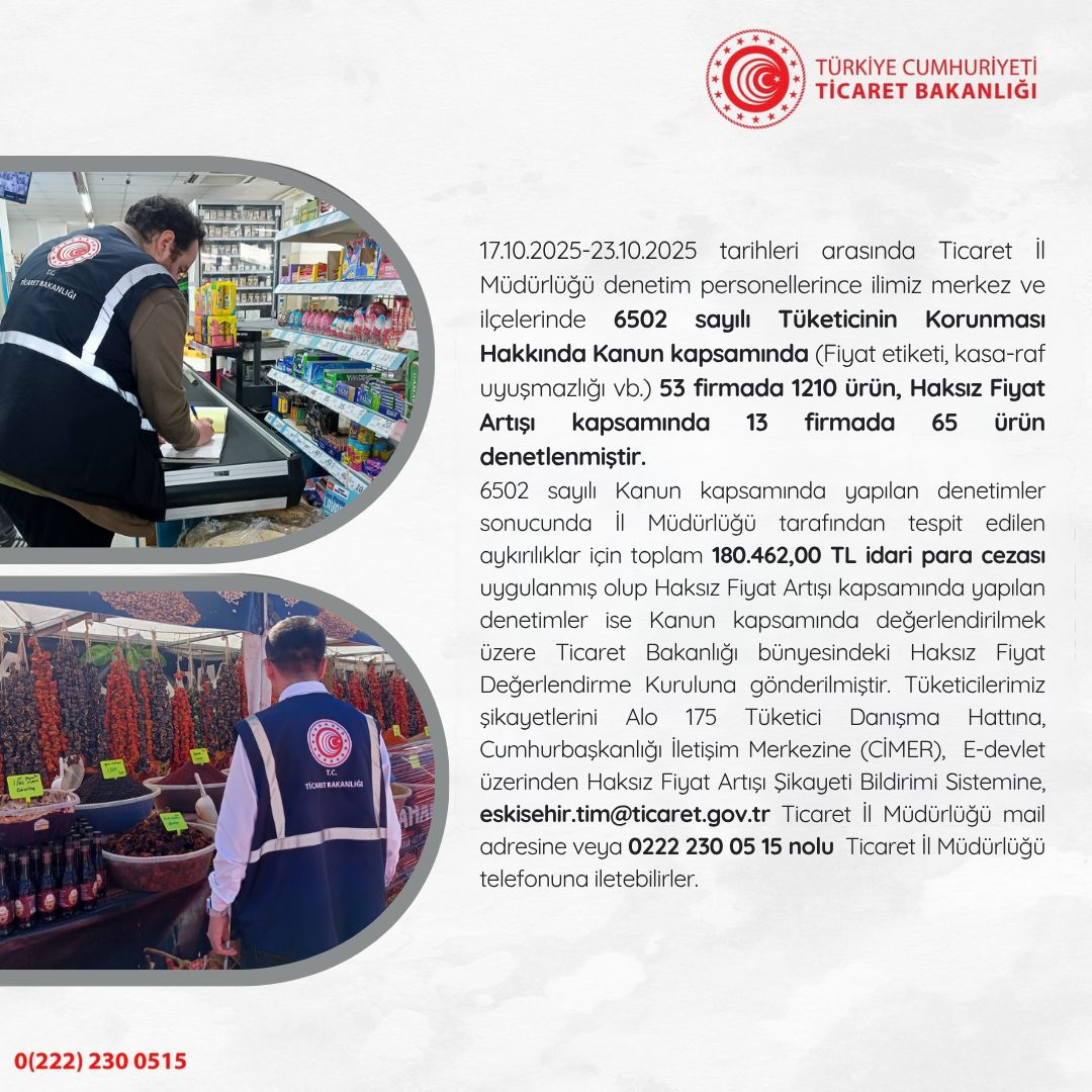 Eskişehir Ticaret İl Müdürlüğü, 17-23 Ekim 2025 tarihleri arasında kent genelinde gerçekleştirdiği denetimlerde çok sayıda işletmeyi mercek altına aldı.