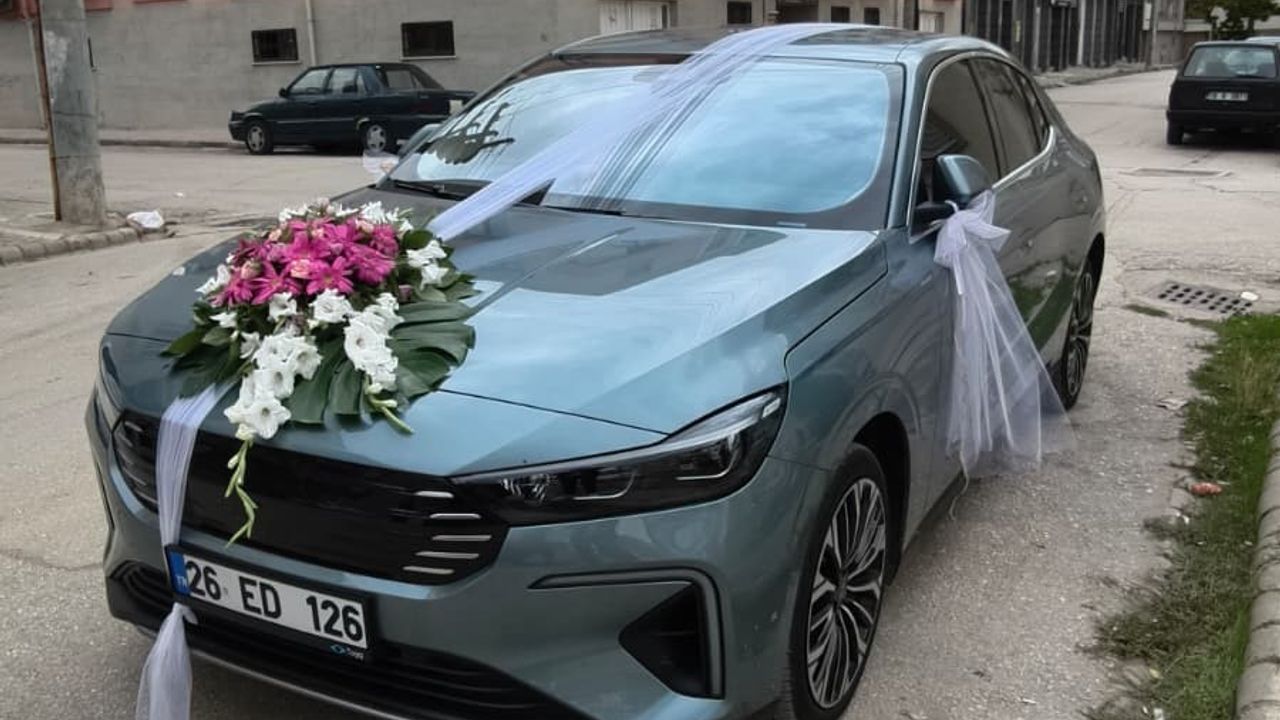 Gelini baba evinden TOGG T10F ile alan damat Emre Tuncer, sevdiklerinin tebriklerini kabul etti. Düğün boyunca akrabalar ve davetliler, yerli sedan otomobil ile bol bol fotoğraf çektirirken, araç çevresinde yoğun incelemeler gerçekleşti.