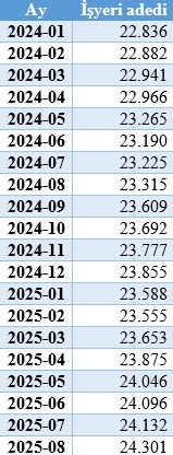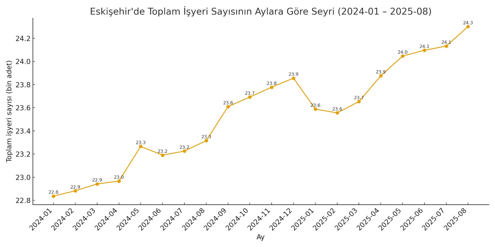 Şubat–Ağustos döneminde 746 yeni işyeri ekonomik hayata katılırken işyeri sayısı 24 bin bandına yerleşti. Kısa süreli gerilemelere rağmen genel eğilim yukarı yönlü seyretti.