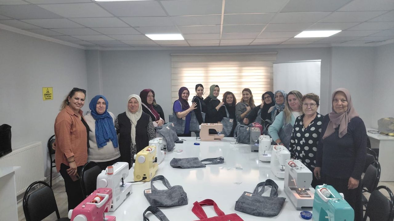 Eğitmenler tarafından verilen bilgilendirme ve tanıtımın ardından kadınlar, kendi elleriyle çanta dikimi gerçekleştirdi.